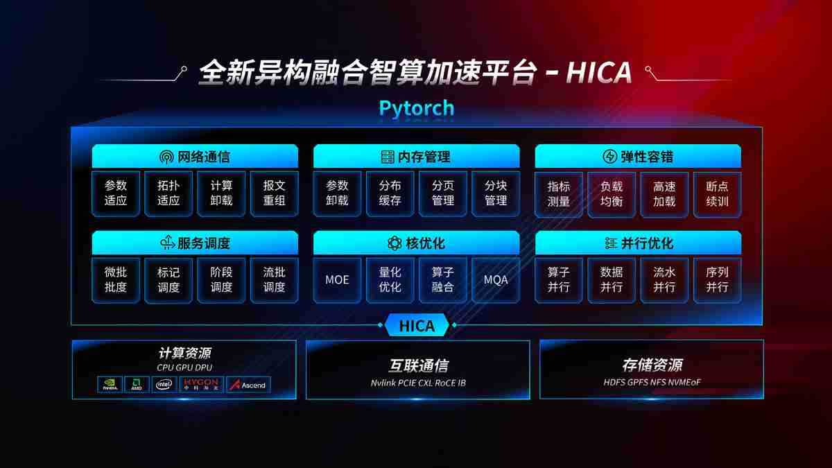 通过自研的服务层、、、中间适配层、、、以及调度编排算法,,,采用数据并行、、、模型并行等多种并行方式,,把并行计算任务进行有效的分解,,,使其分别由相应的软件栈和算力资源来承接。。。。当GPU资源变化,,,HICA可以实时动态调度计算子任务并调整模型拓扑和架构,,,以充分聚合各种算力资源。。。