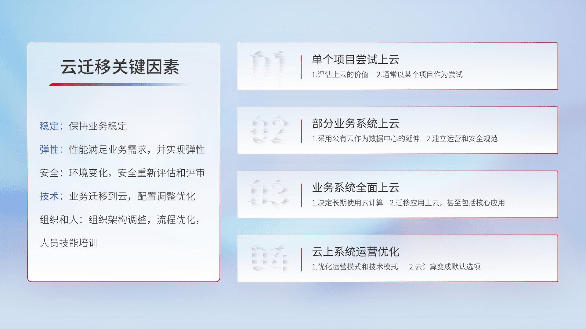 结合实际业务,,,从规划设计、、、云平台选型、、、云原生改造、、数据迁移、、、集成交付,,,,迁移全过程为客户识别最佳上云路径,,做好风险识别管理,,,设计网络架构、、身份权限、、、安全审计合规、、操作审计、、日志审计、、、监控告警策略、、、多站点容灾设计等,,对云上基础设施进行整体规划,,,提升IT治理水平,,,以满足弹性、、、高可用、、、高性能的需求。。。。