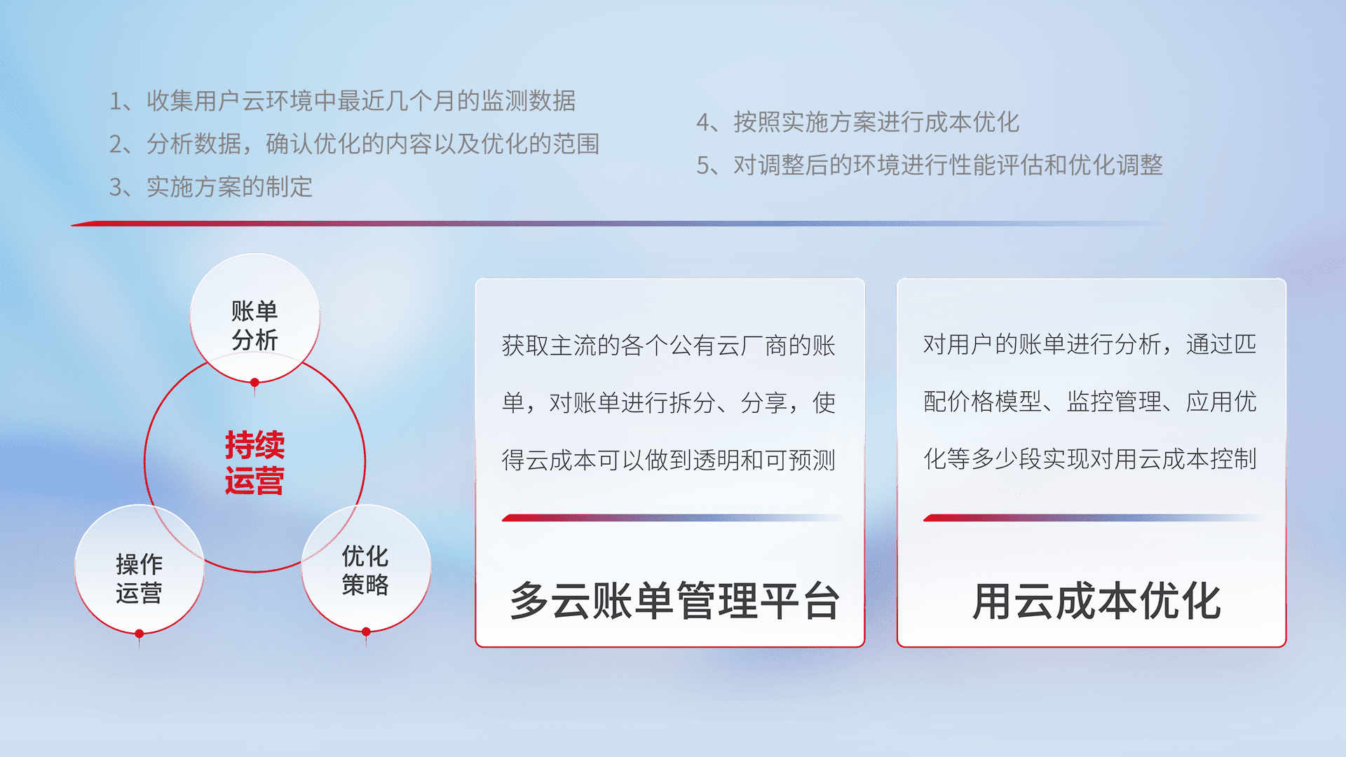 通过多云纳管,,,,以统一的资源数据模型把客户的云资源进行抽象和封装,,,进而实现对多云资源的统一操作,,保障云资源管理的可靠性、、、、稳定性与可用性。。量身定制化运维内容,,配置、、、开发运维、、、、补丁管理、、、备份、、、监控、、、、认证和访问管理、、、审计和日常巡检等,,,保障在用云过程中的可靠度,,,,稳定度以及高可用率。。。。