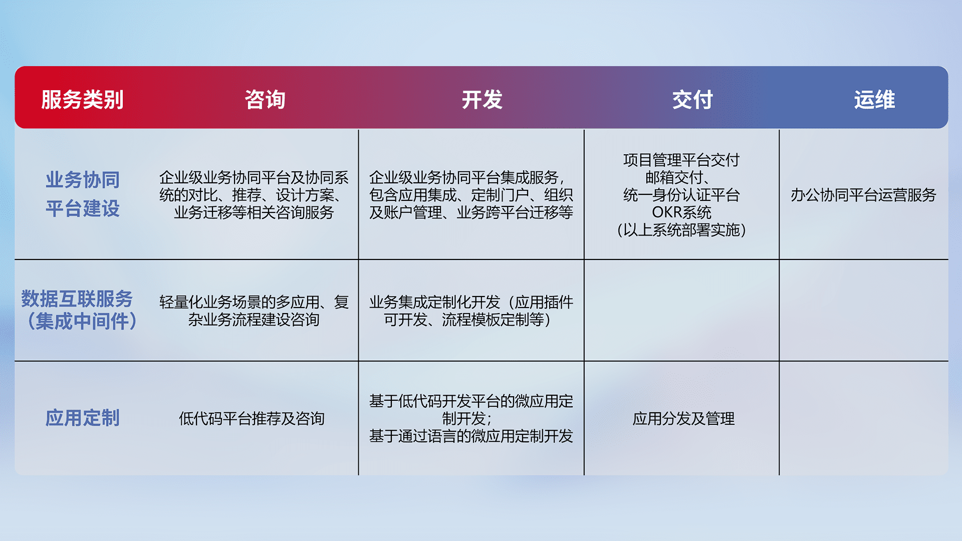 针对钉钉、、、企微、、IDaas等平台级产品提供产品的规划、、、、方案、、、交付、、、定制化开发等服务,,实现如统一协同办公、、、智能客户服务、、、、混合会议管理、、、智能数据查询、、等业务场景,,,,实现数字化转型。。。